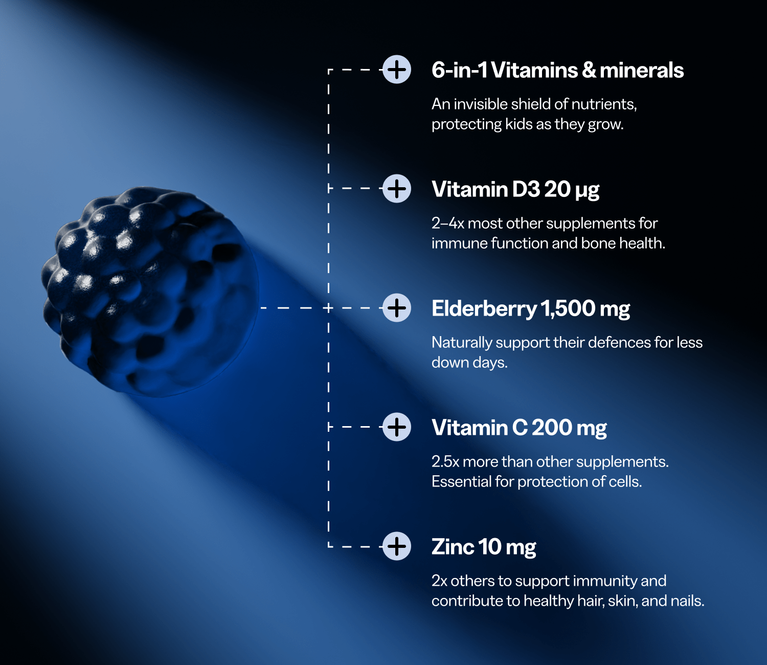 That’s why we created our Kids Immunity Gummies, packed with 8 essential vitamins, minerals, and elderberries to strengthen defences, reduce tiredness, and support overall resilience. All in two tasty gummies they’ll actually want to eat (no bribery required).